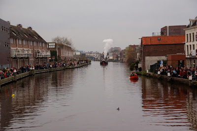 Kades vol met zingende en zwaaiende kinderen en daar komt hij dan.... tis vast de echte stoomboot, hij stoomt geweldig mooi!